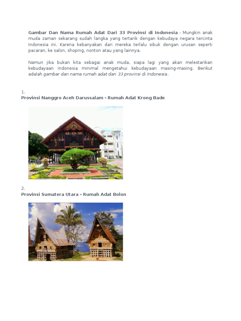 Rumah adat di indonesia antara lain rumah adat balon dari sumatera utara, rumah adat gadang dari sumatera barat, rumah adat rakyat dari bengkulu, rumah adat badui dari banten dan masih banyak lagi dalam artikel ini. Nama lain dari rumah adat gadang adalah rumah bagonjong, rumah baanjuang, dan rumah godang. Rumah adat krong bade merupakan rumah adat provinsi aceh.